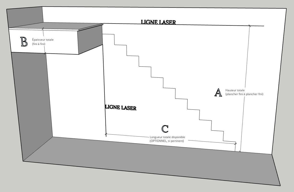 - Mesure A: Représente la hauteur totale entre le plancher FINI au bas de l’escalier et le plancher FINI au haut de l’escalier.