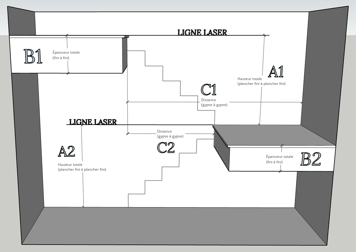 - Mesure C2: Représente la distance entre le gypse du plancher au haut de l’escalier et le gypse du palier.